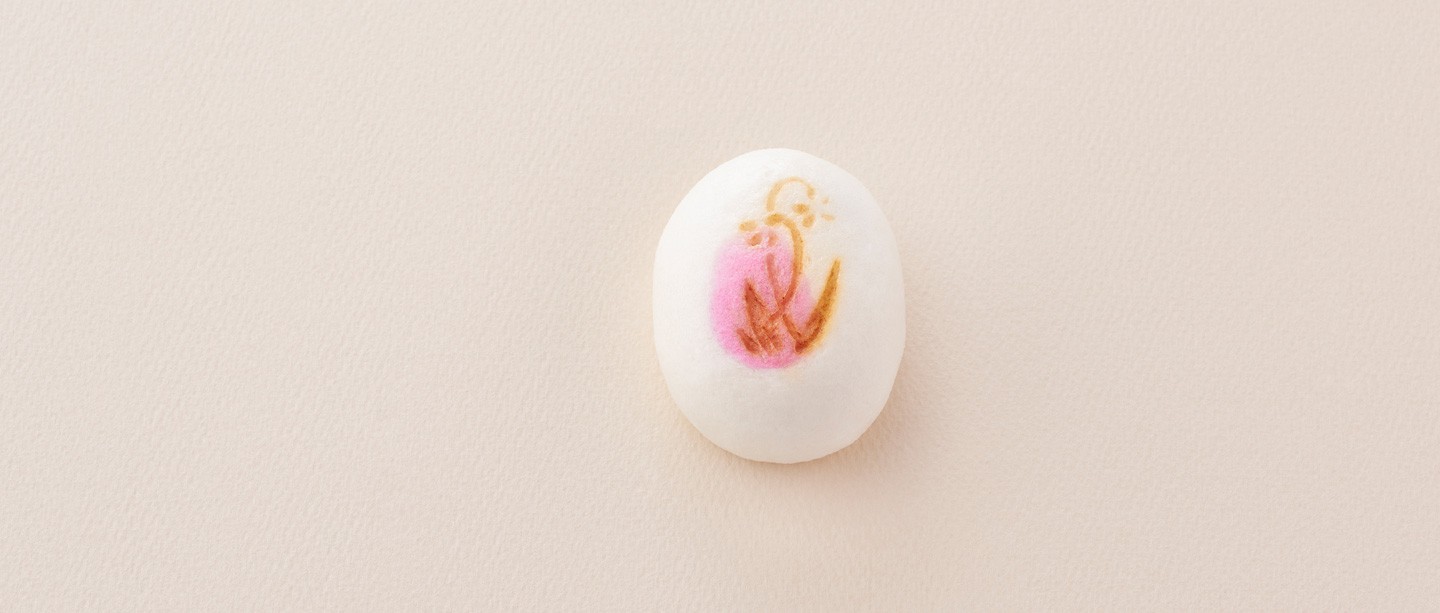 すみれの可憐な姿と紫の色合いは春の訪れを実感させます。『新春の川沿』は、小判形の薯蕷饅頭に紫色のにおい(色差し)をつけ、すみれの焼き印を押した菓子です。のどかな春の川辺の情景が連想される意匠です。