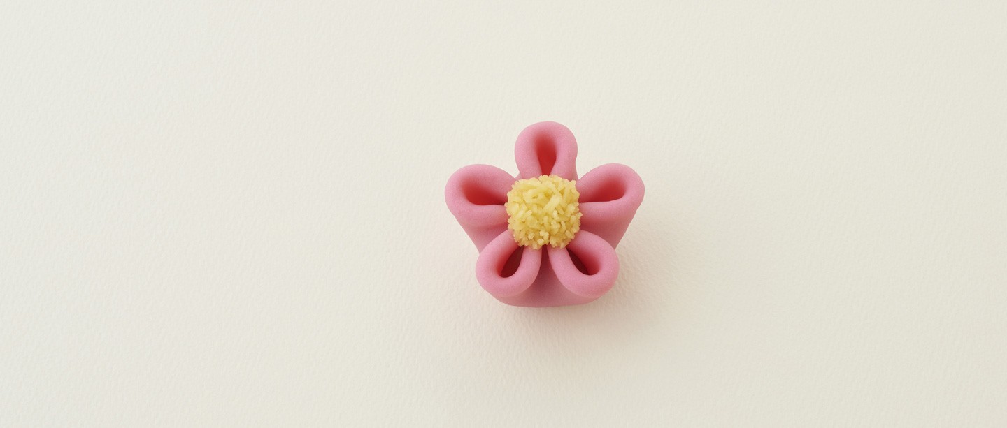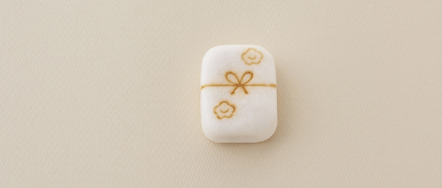 「この花」とは『古今和歌集』序に王仁(わに)博士により「なにはづに咲くやこの花冬ごもり今は春べと咲くやこの花」と詠まれた梅のことです。また、「文庫」とは手箱を意味します。『木花文庫』は四角形の薯蕷製の表面に結び紐と2輪の梅の焼き印を配し、梅模様の手箱を意匠化しています。