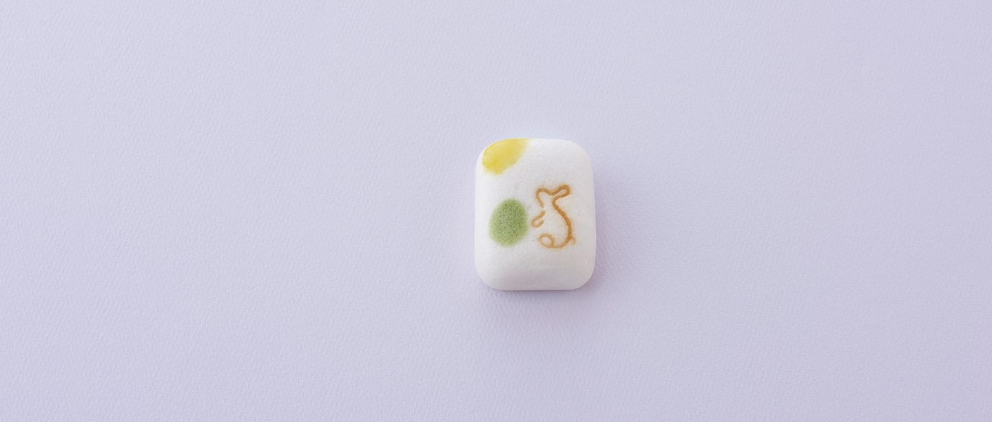 Gâteau brioché à base de farine de riz et d’igname japonaise, fourré à la pâte d’azuki blancs. Pour célébrer la tradition du tsukimi, un lapin chérissant la lune est représenté debout dans les herbes hautes.