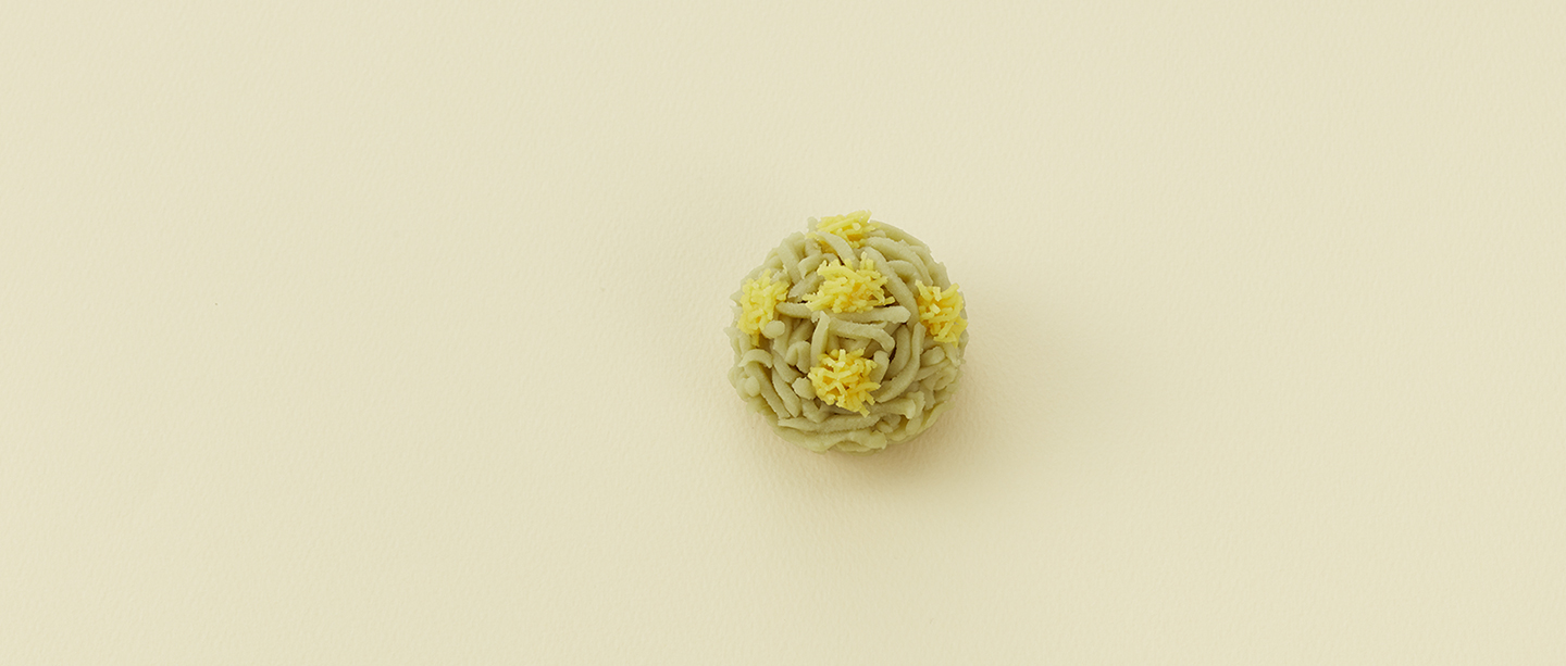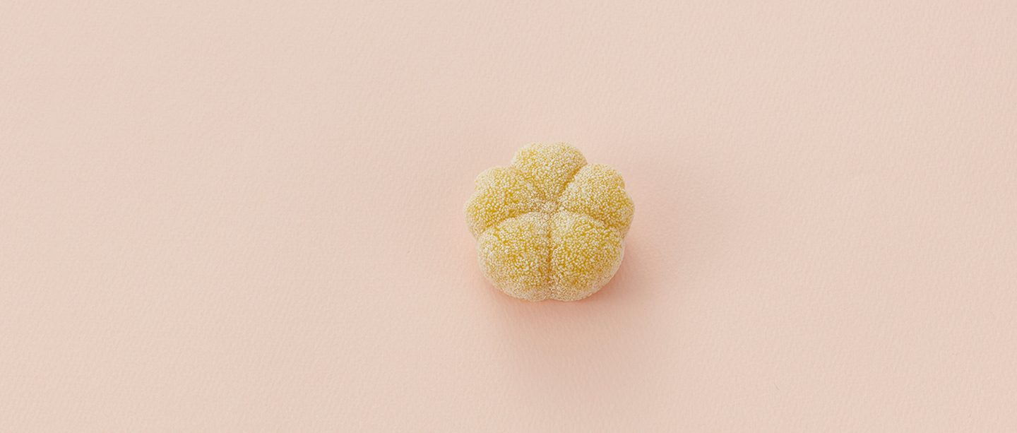 Fine pâte de riz gyûhi fourrée à la pâte d’azuki blancs, saupoudrée de farine de riz légèrement grillée.